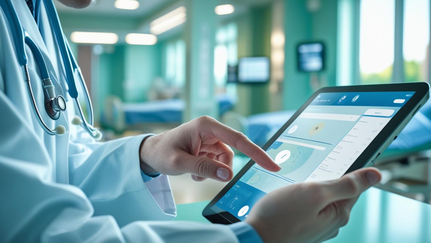 hand of a doctor working on the tablet in a hospital