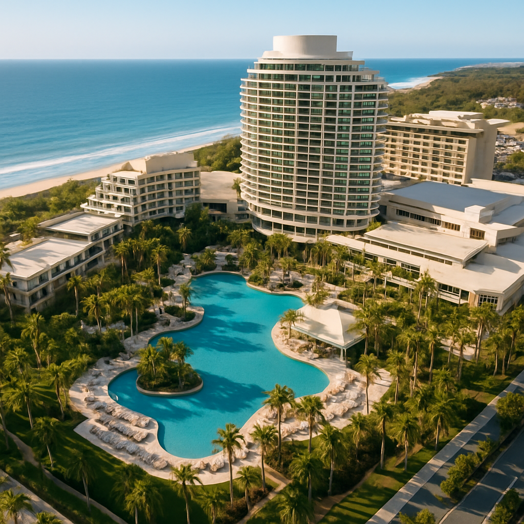 Aerial view of a large resort complex featuring multiple buildings, a large, free-form swimming pool with islands and surrounding lounge areas, numerous palm trees, and a sandy beach leading to the ocean in the background.