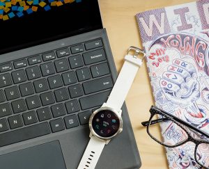 A watch on a laptop with a book and glasses on the side