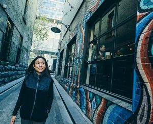 women smiling and walking in an alley