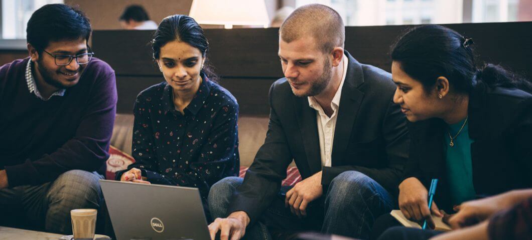a group of people looking in the laptop