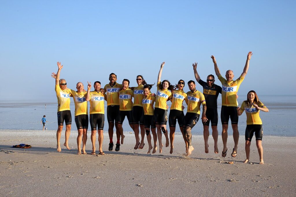 After breakfast it was time to celebrate the tour with photos of the sponsors’ kits just after the sun had risen. First up it was Jabra, followed by Telstra, Microsoft and finishing with AWS. We then chose our favourite jersey to construct “TourXOz” across the sand on 80 Mile Beach and this was my favourite shot after the KJR Yellow jersey shot. The KJR Yellow jumping shot is something to behold with a fantastic collection of riders recognised for excellence, persistence and determination.
